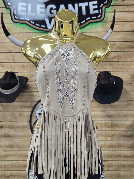 Lucky & Blessed Womens Halter Fringed Top W Boot Stitch Embroidery & Studs