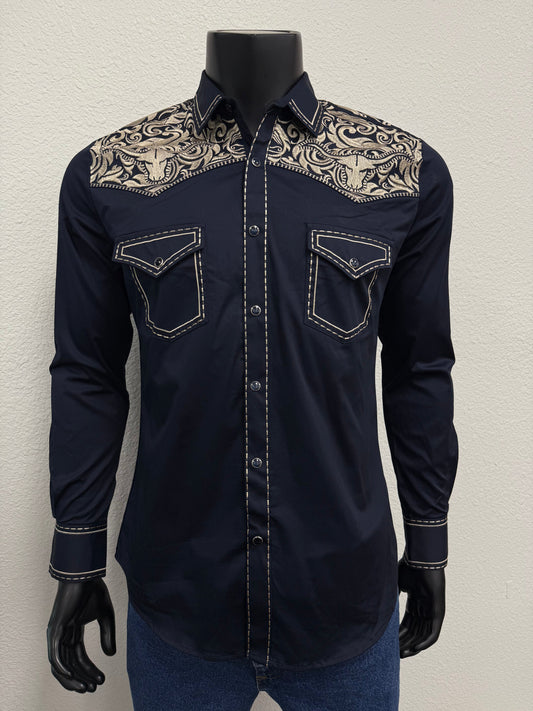 Montero Mens Western Embroidered Bull Long Sleeve Shirt - Black, Navy, White