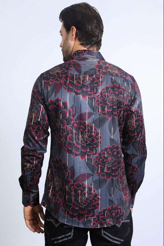 Platini Mens Modern Fit Stretch Floral Print Shirt (Black)