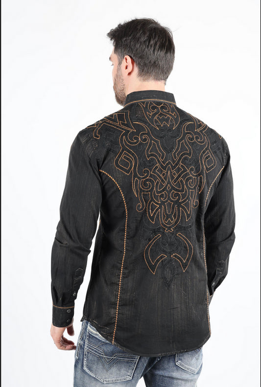 Platini Mens Vintage Washed 2-tone Embroidery Modern Fit Stretch Shirt (Black and Orange)