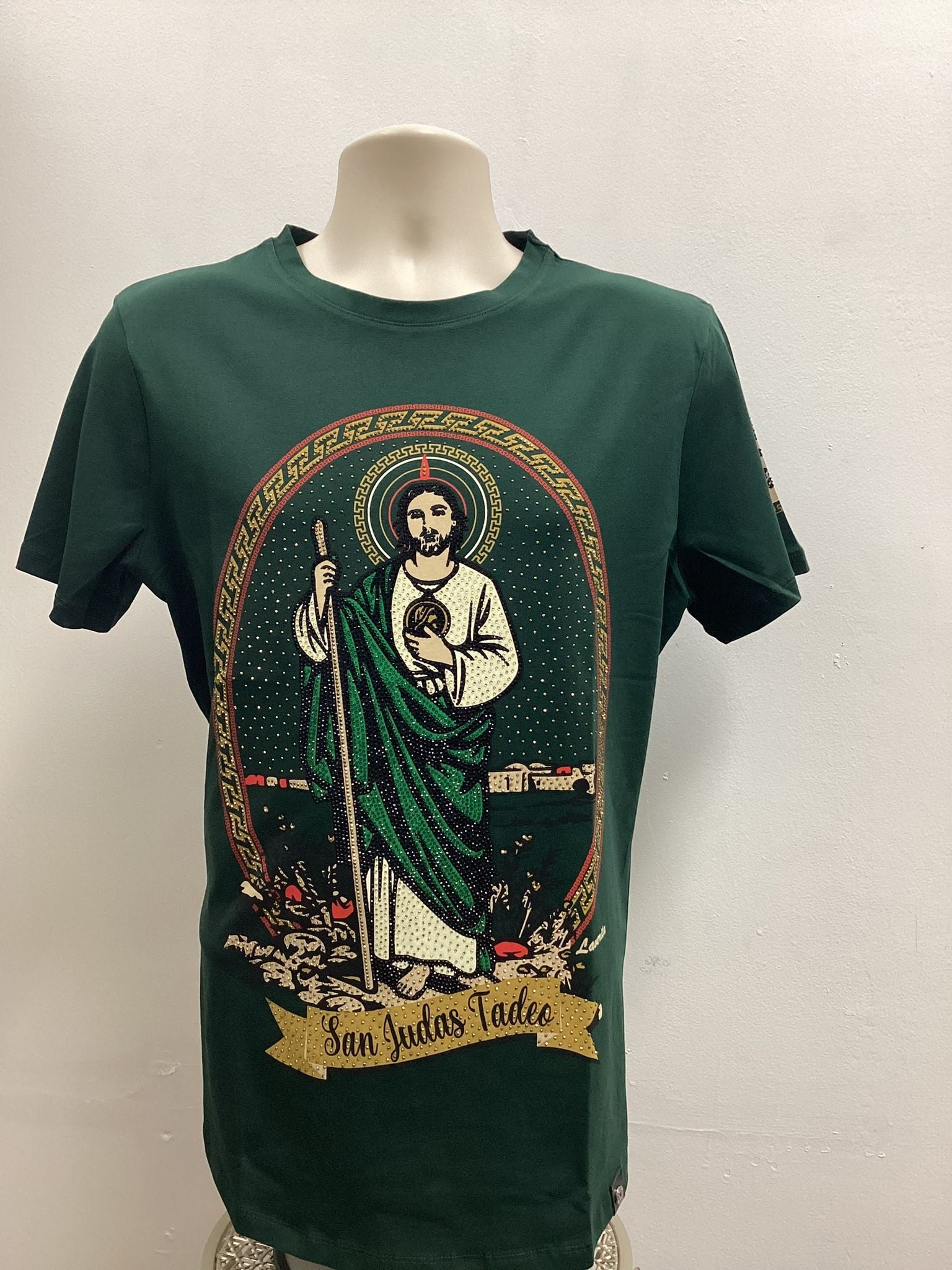 Laveritas San Judas Tadeo t-shirt is perfect for any occasion. This shirt features San Judas overlayed with Rhinestones to stand out. The back features a rhinestoned San Judas.