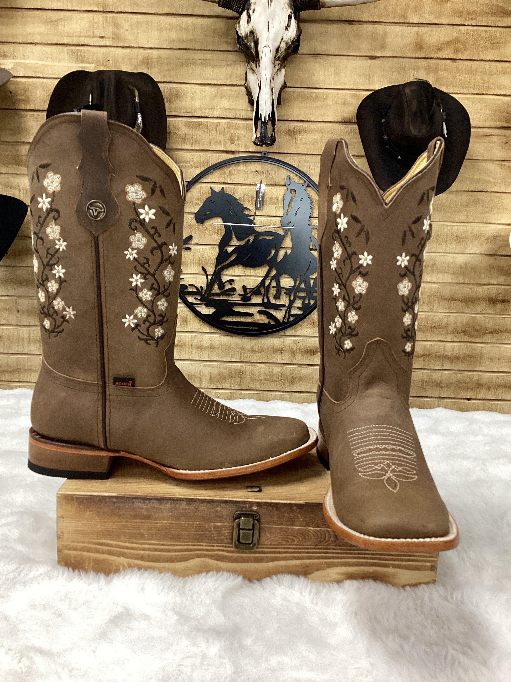 Cowgirl leather boots crafted with high quality materials These boots feature flower embroidery on the shaft.