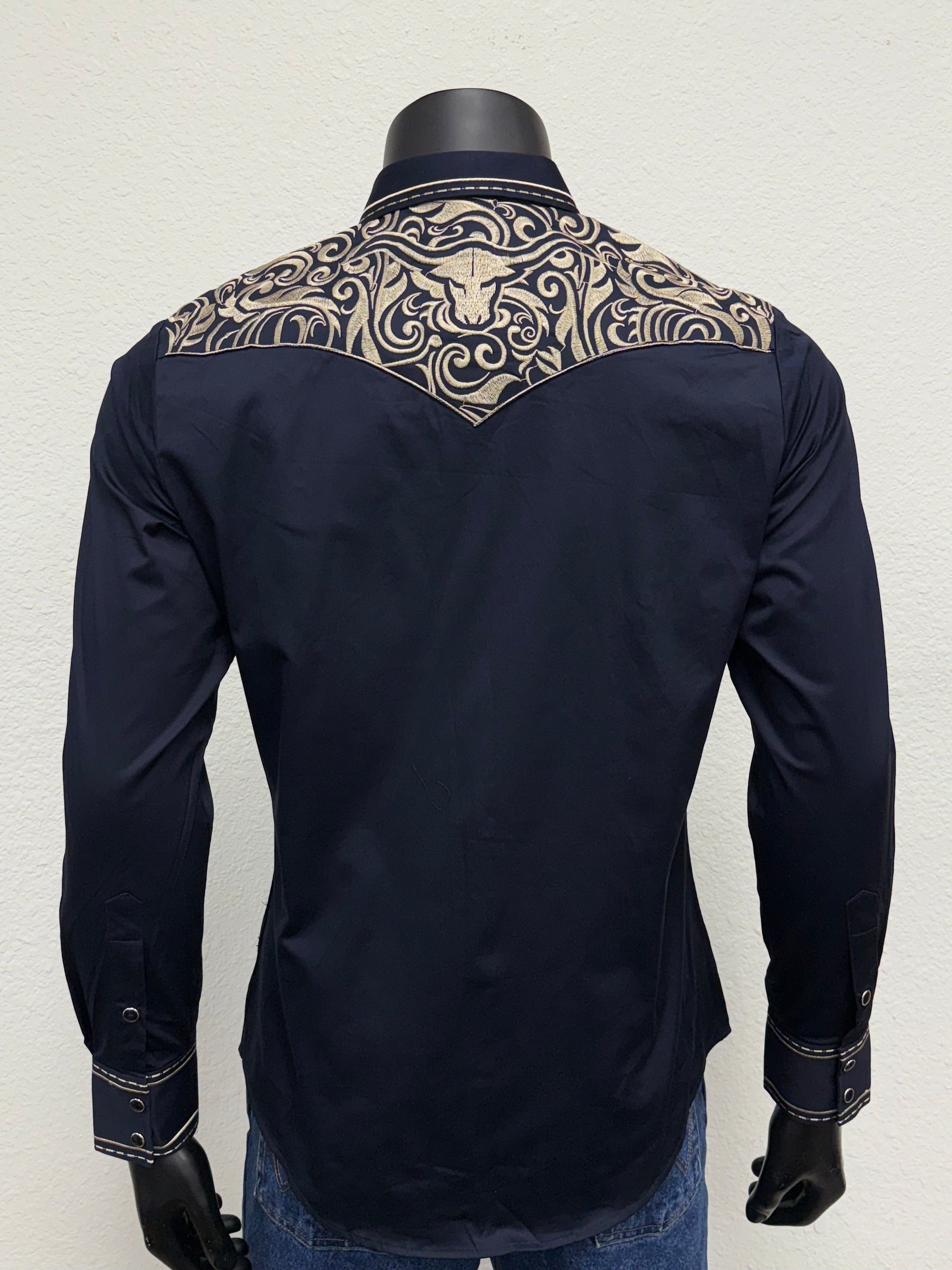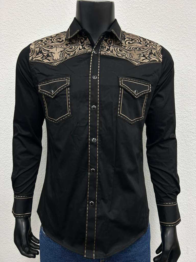Montero Mens Western Embroidered Bull Long Sleeve Shirt - Black, Navy, White