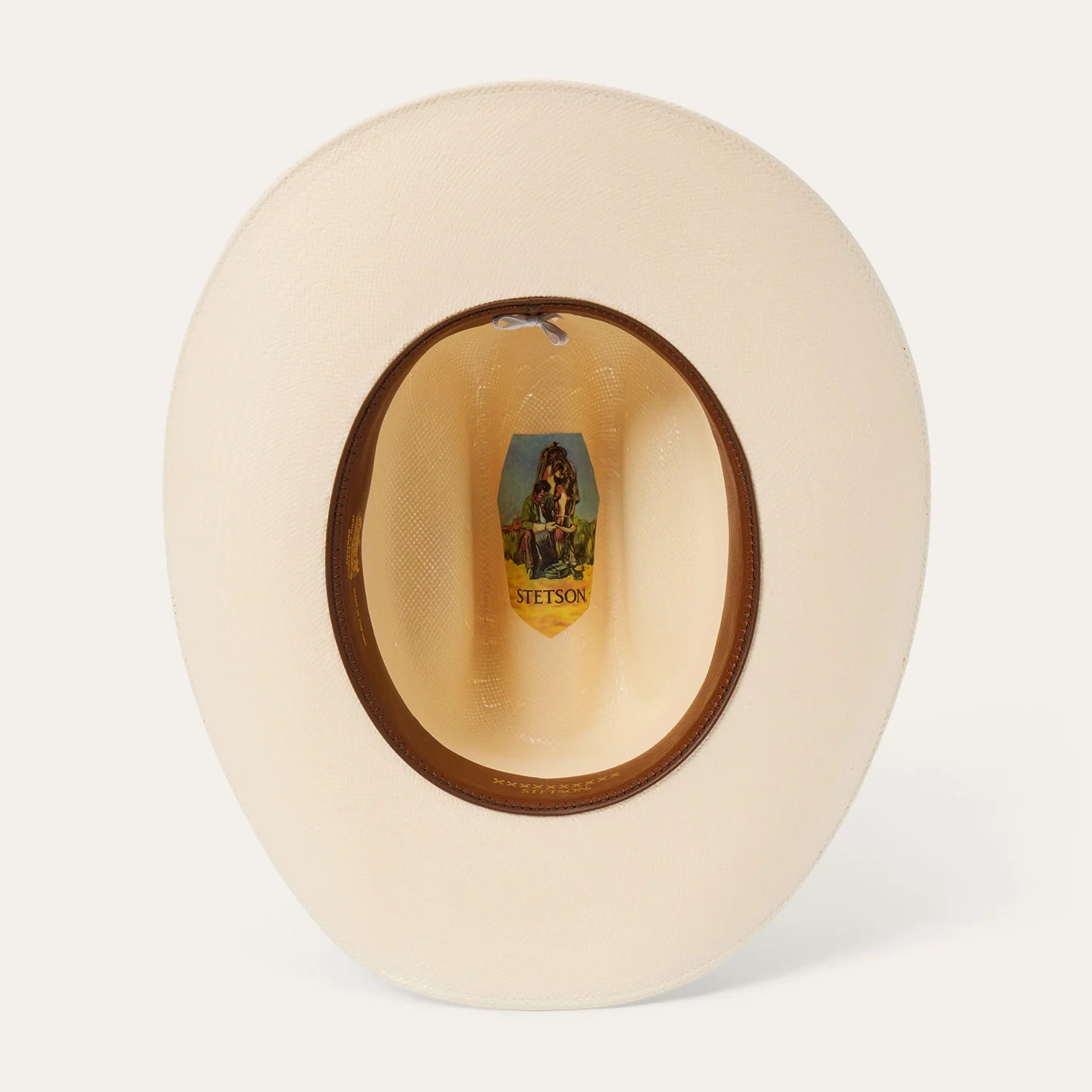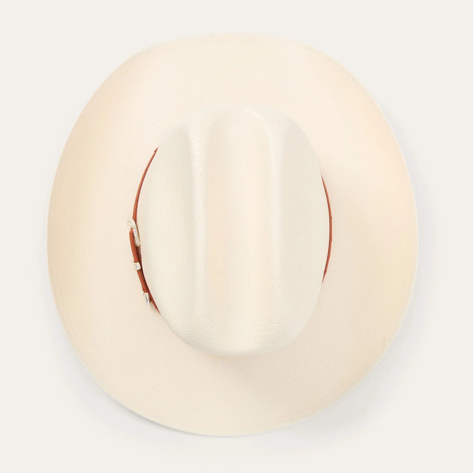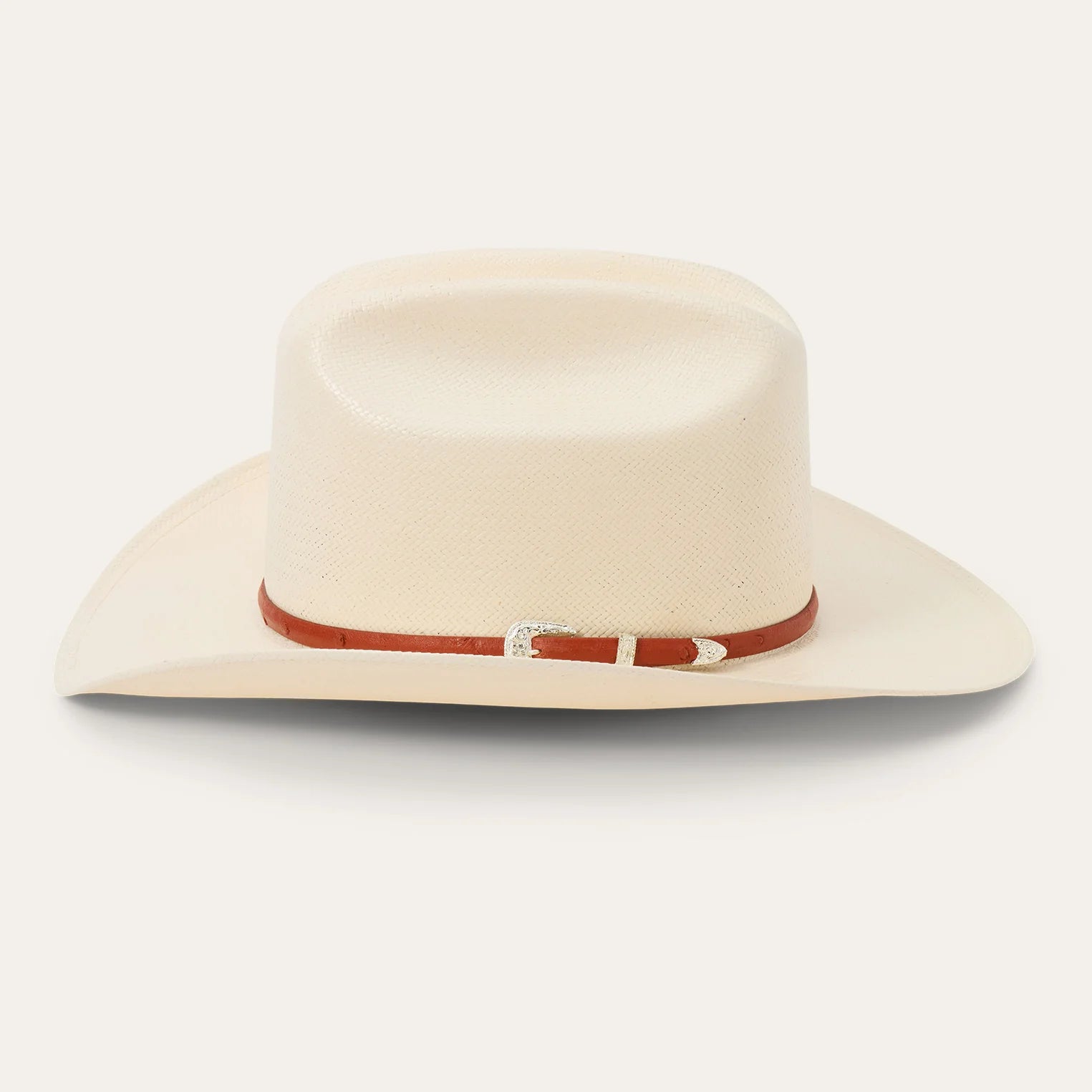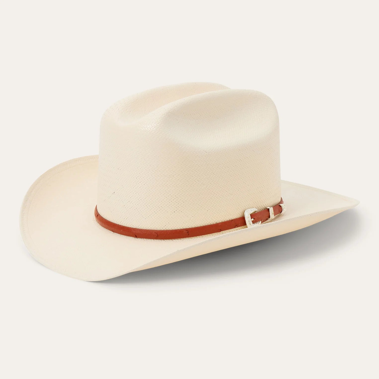 Handwoven one strand at a time in the U.S.A. from 10X quality shantung straw, the Primo Cognac combines our legendary craftsmanship with a timeless western profile, featuring a 4 ⅜” wide oval cattleman crown and 3 ½” slightly curved brim. It has a leather hatband with traditional three-piece silver-tone buckle set and a genuine leather sweatband for a secure, comfortable fit.