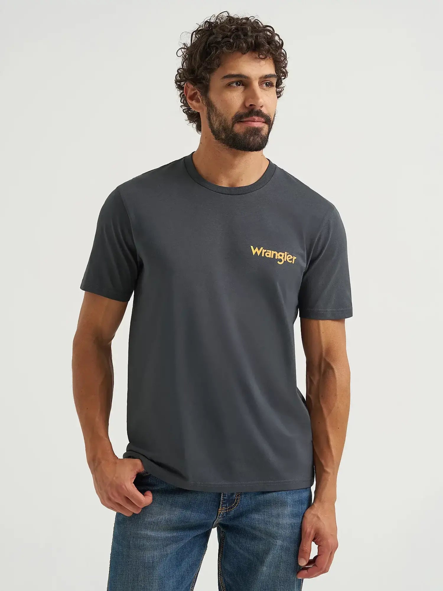 Inspired by one of the roughest sports in rodeo, this men's tee comes with a splattered design of a saddle bronc riding pro in his element, showing what it takes to last eight seconds on the back of a formidable opponent. It also comes with the official Wrangler® logo for a stamp of authenticity.